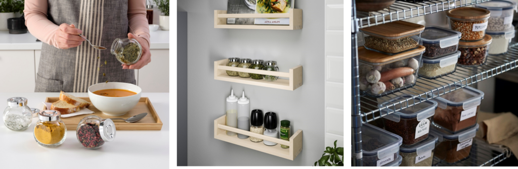 Solusinya ? Mulailah dengan sistem penyimpanan yang membuat setiap benda memiliki tempatnya sendiri. Koleksi seperti RAJTAN dapat membantu menyusun bumbu dapur agar lebih mudah dijangkau dan enak dilihat, serta dapat dipadukan dengan rak bumbu BEKVÄM.