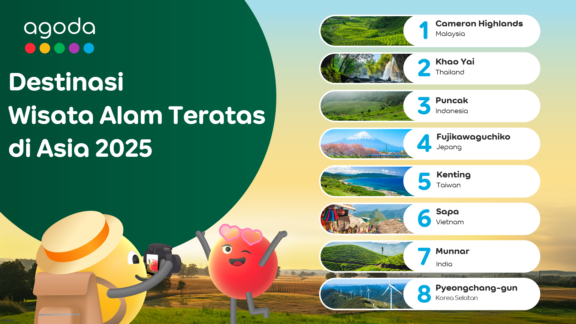 Setelah tiga besar, data Agoda juga menempatkan Fujikawaguchiko (Jepang), Kenting (Taiwan), Sapa (Vietnam), Munnar (India), dan Pyeongchang-gun (Korea Selatan) sebagai bagian dari delapan destinasi wisata alam terbaik di Asia.